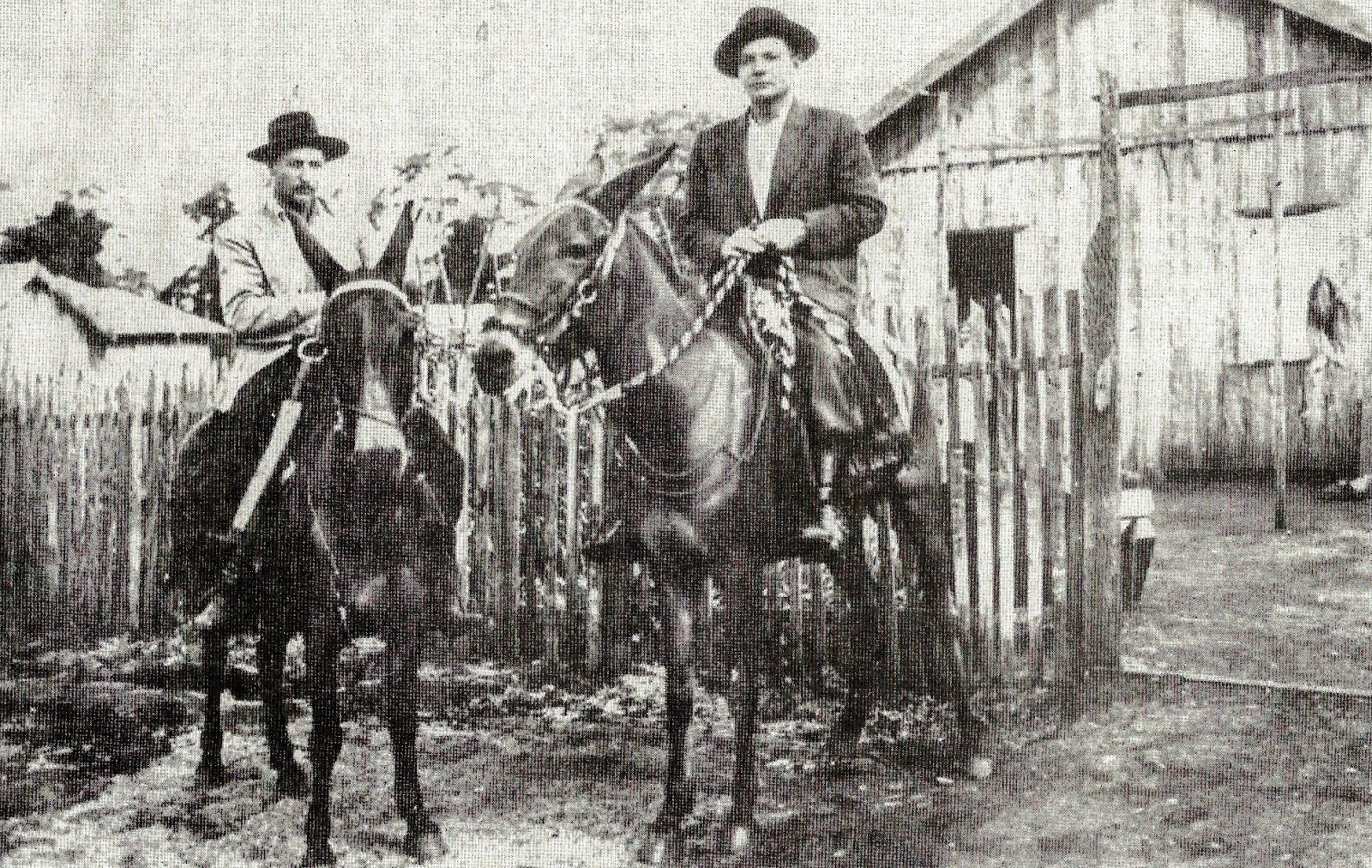 À direita, Inocente Villanova Jr. (PTB) em campanha a cavalo por algum ponto de Maringá durante a primeira corrida eleitoral da prefeitura, em 1952.