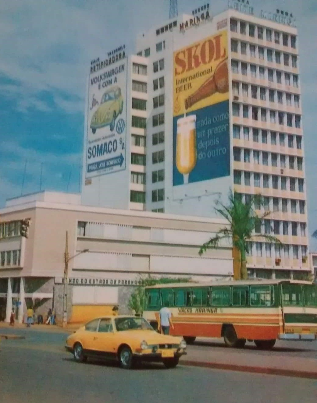 Ao fundo, o prédio do Banco do Estado do Paraná. À direita, o edifício Três Marias com as tradicionais mega propagandas da SOMACO e da SKOL.