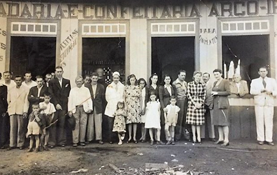 Poucos haviam relacionado a foto da inauguração da Padaria e Confeitaria Arco-Íris, de 1.º de novembro de 1947, a uma edificação de madeira. Clique AQUI e confira esse evento. O fato é que recepcionamos uma imagem de sua fachada original, antes dela ter sido remodelada para a habitual estrutura em alvenaria que ficou mais conhecida.