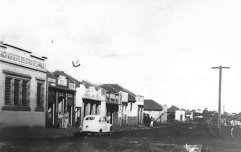 À esquerda, na esquina com a avenida Brasil, aparece o primeiro prédio do Banco Noroeste do Estado de S. Paulo. Na sequência, entre diversos outros estabelecimentos, está demarcado com a seta o Foto Lux, de Augusto Eduardo Eidam.