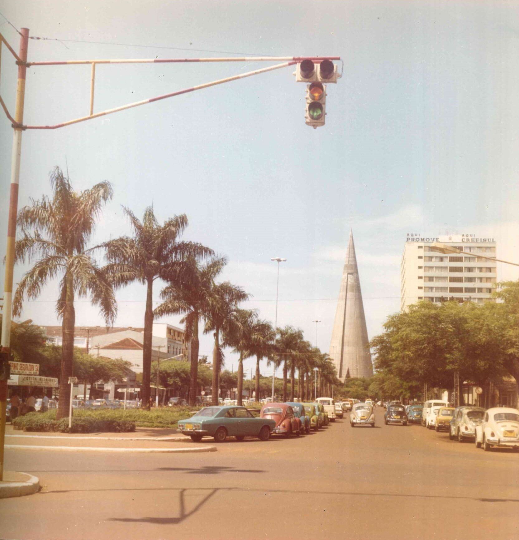 O registro mostra o encontro da avenida Getúlio Vargas com a rua Santos Dumont, ao longo da primeira metade da década de 1970. Além da Catedral Nossa Senhora da Glória, que teve parte da obra bruta concluída em outubro de 1972, vê-se à direita o Edifício Maria Tereza com os luminosos da Promove e da Crefisul, empresas responsáveis por parte de sua incorporação.