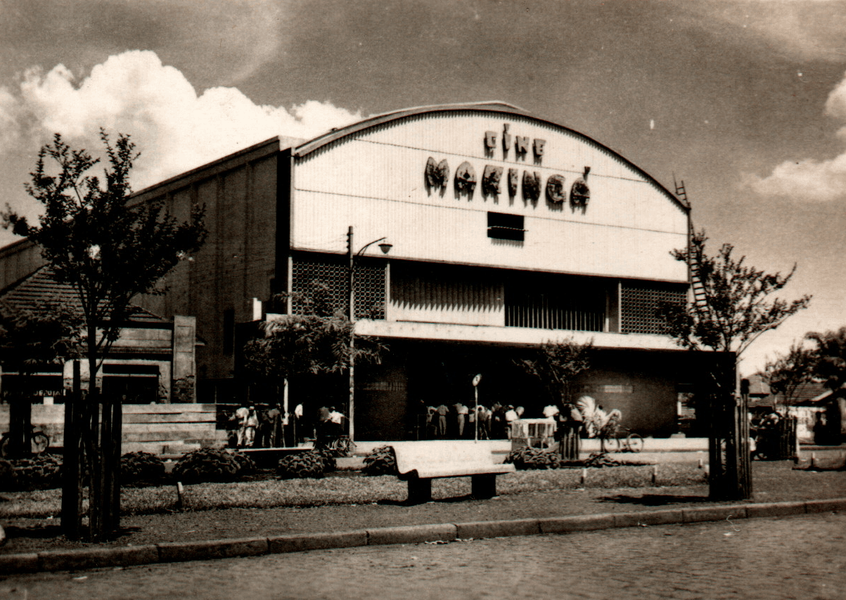 Feita na primeira metade dos anos 1950, a foto mostra um dos estabelecimentos de diversão mais lembrados pelos maringaenses que viveram o período. O Cine Maringá foi transferido para a então avenida Ipiranga (atual Getúlio Vargas) em maio de 1953, durante as festividades do 6º aniversário da cidade. Funcionando desde 1948 em outro endereço, na avenida Brasil, em frente à então praça da Rodoviária (hoje Napoleão Moreira da Silva), o empreendimento foi constituído por Odwaldo Bueno Netto e administrado por seus filhos.