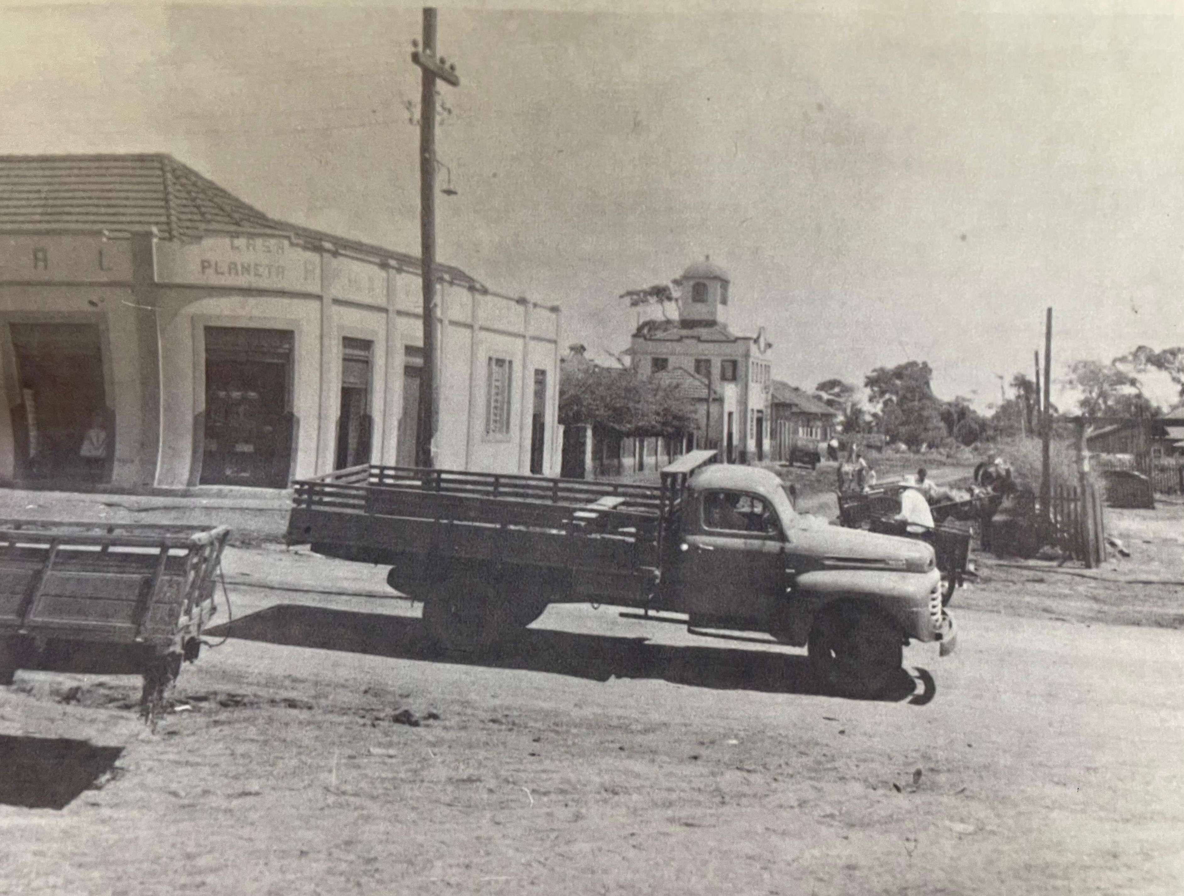 Provavelmente feita no final da década de 1940, a imagem mostra a então rua Moscados (hoje Santa Joaquina de Vedruna), na esquina com a avenida Brasil, por onde os caminhões circulam.