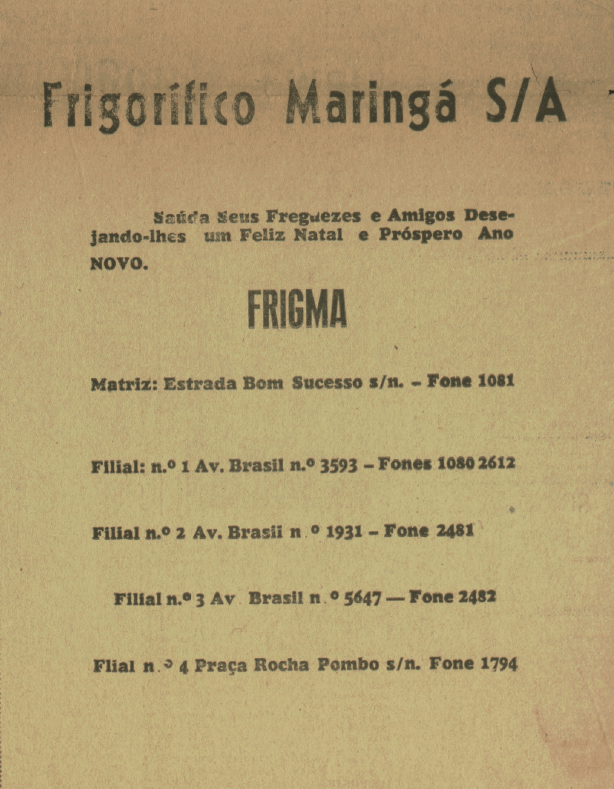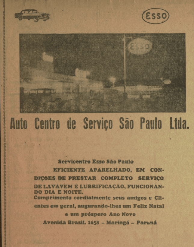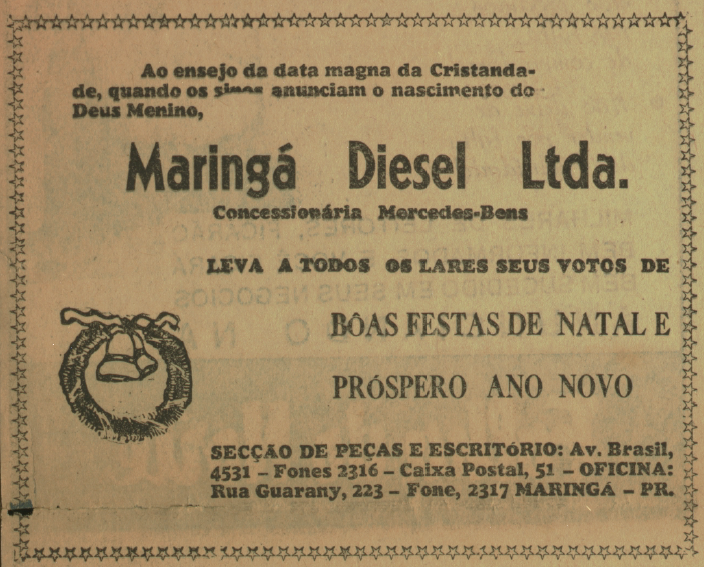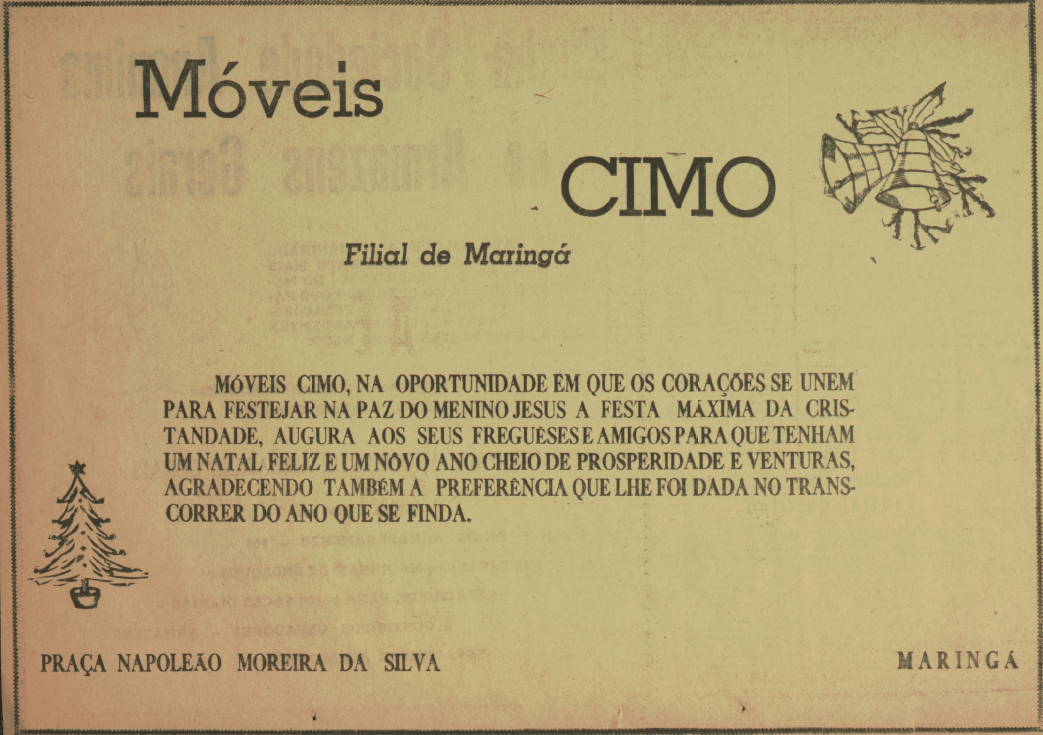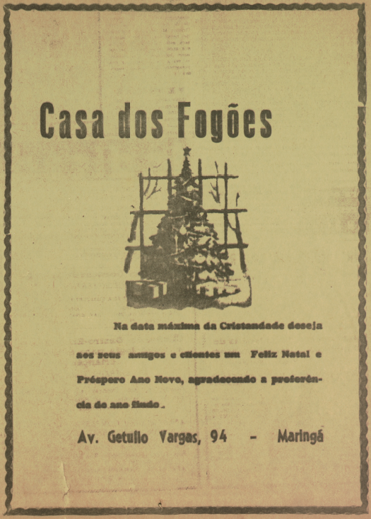 A seguir, alguns dos anúncios veiculados naquela edição comemorativa: 1º) Casa dos Fogões, que funcionava na avenida Getúlio Vargas, nº 94; 2º) Auto Centro de Serviço São Paulo, também conhecido como Servicentro Esso São Paulo, localizado na avenida Brasil, nº 1.658, esquina com a avenida Paraná; 3º) Indaiá Hotel, situado na atual rua Basílio Sautchuk, esquina com a rua Joubert de Carvalho; 4º) Frigorífico Maringá (Frigma), que, além do abatedouro na estrada Bom Sucesso (atual continuação da avenida Cerro Azul), mantinha mais quatro açougues espalhados pela cidade; 5º) Maringá Diesel Ltda., concessionária de caminhões Mercedes-Benz; 6º) Móveis Cimo, que teve loja na praça Napoleão Moreira da Silva e fabricou as poltronas de diversos cinemas da cidade, como o Cine Horizonte.
