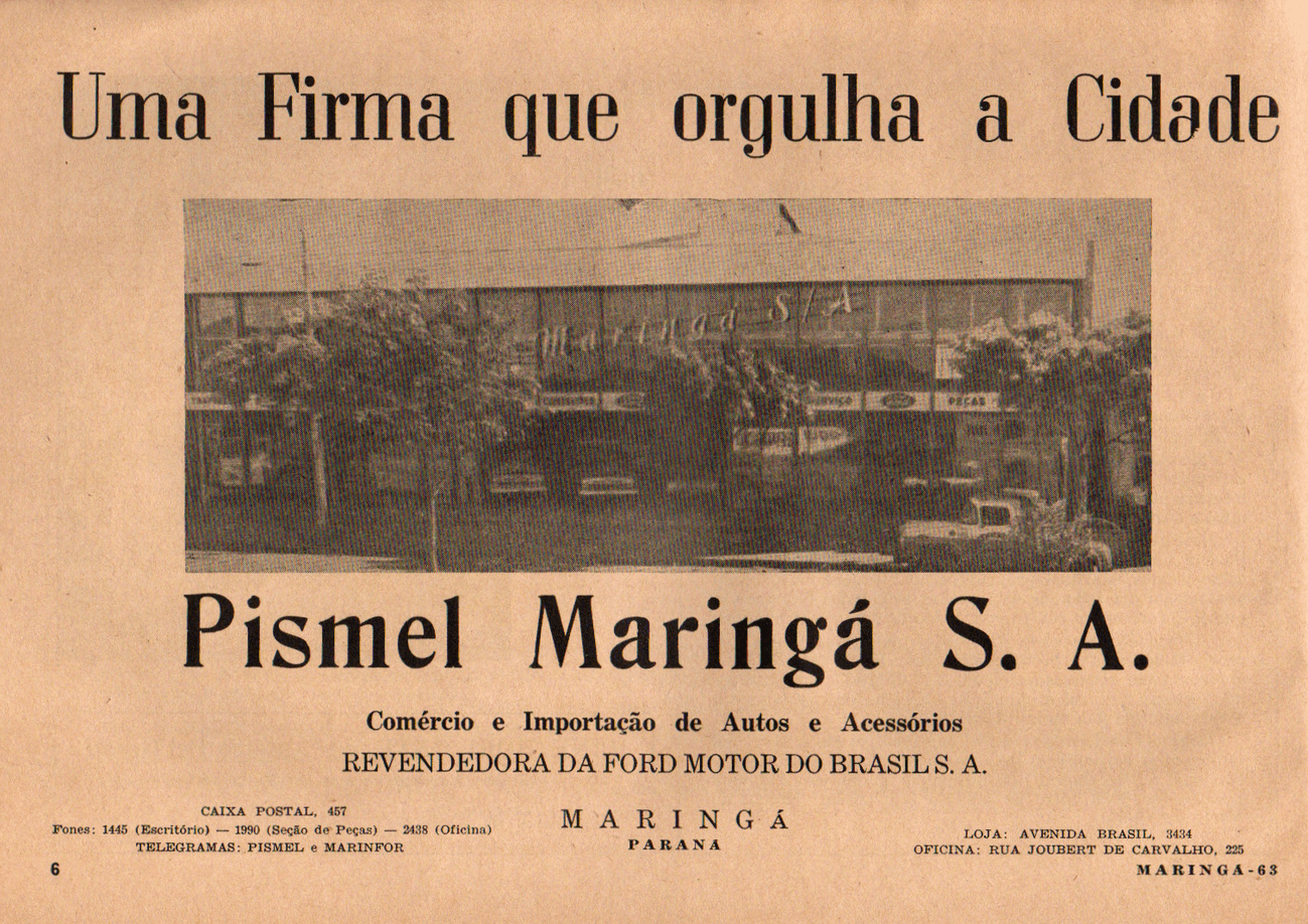 Veiculado em maio de 1963, este anúncio apresenta a concessionária Pismel Maringá S.A. como “uma firma que orgulha a cidade”.