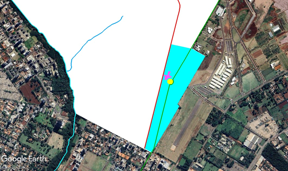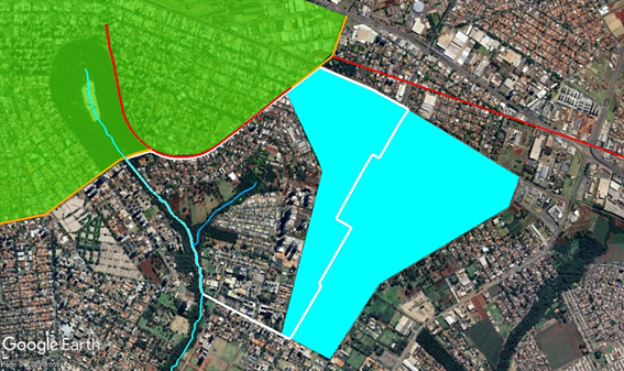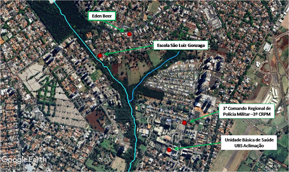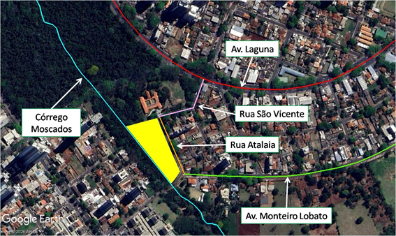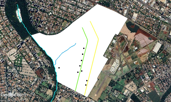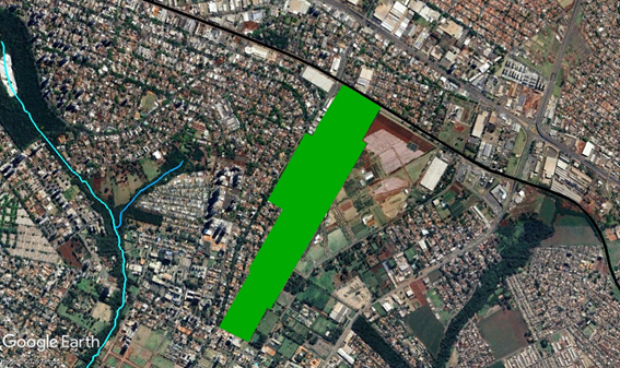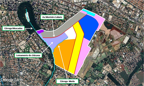 Na margem direita do Córrego Merlo, há áreas com baixa ocupação populacional e poucas construções.