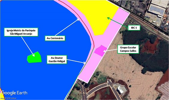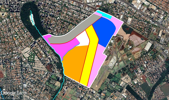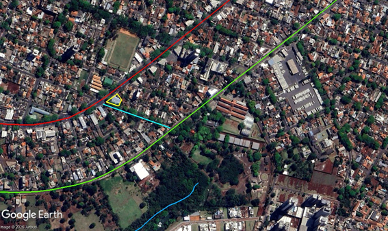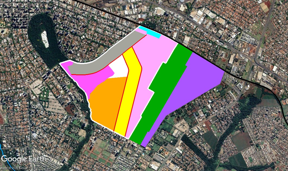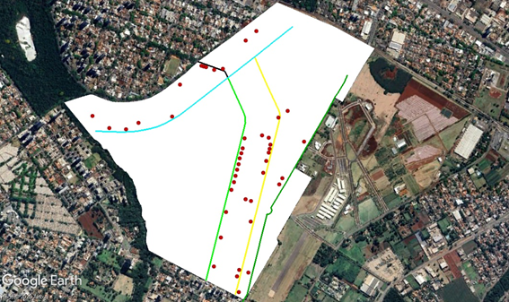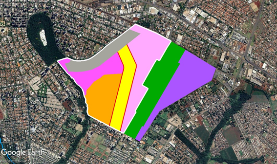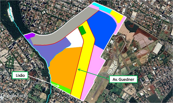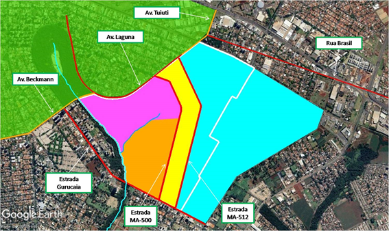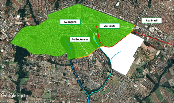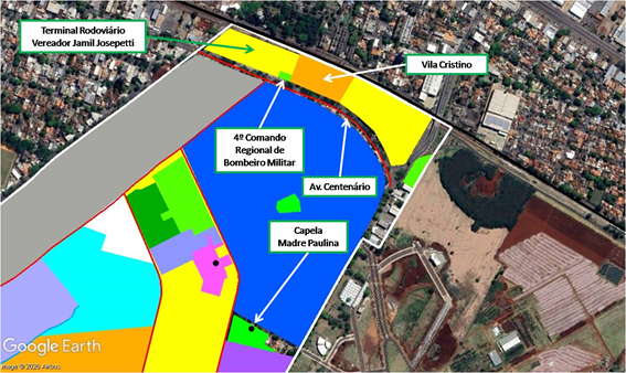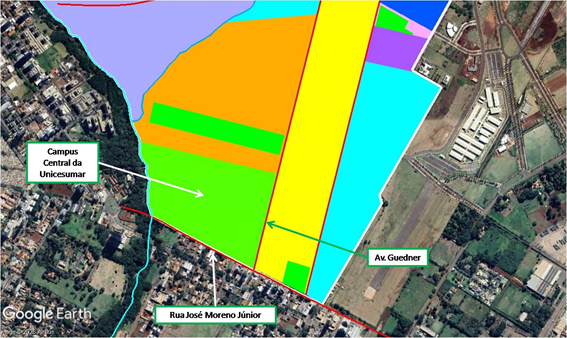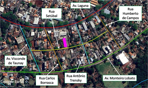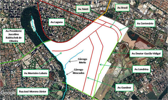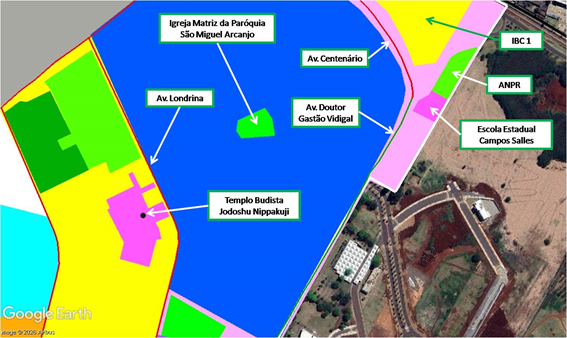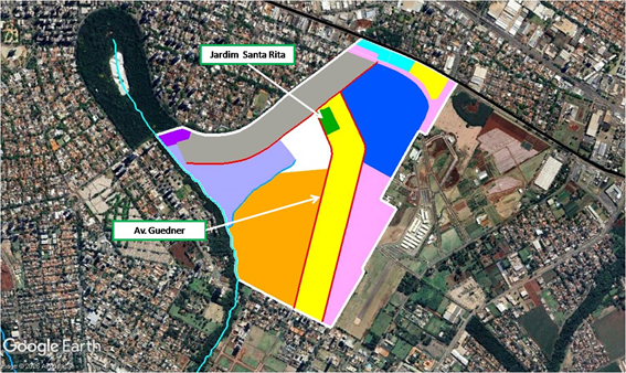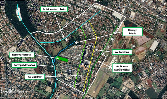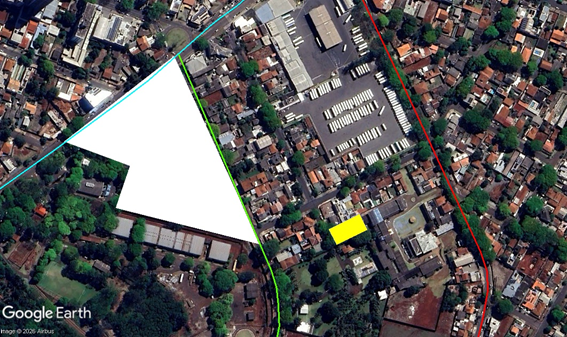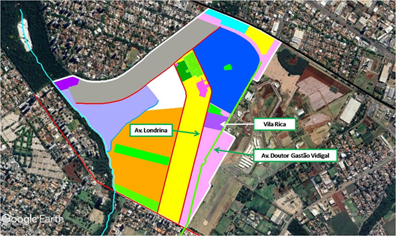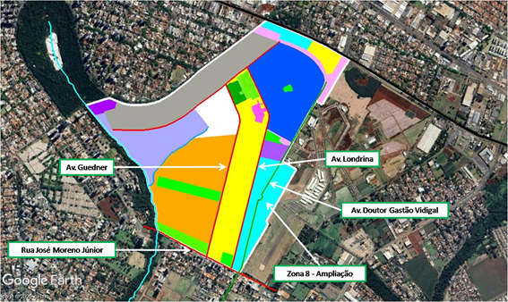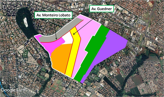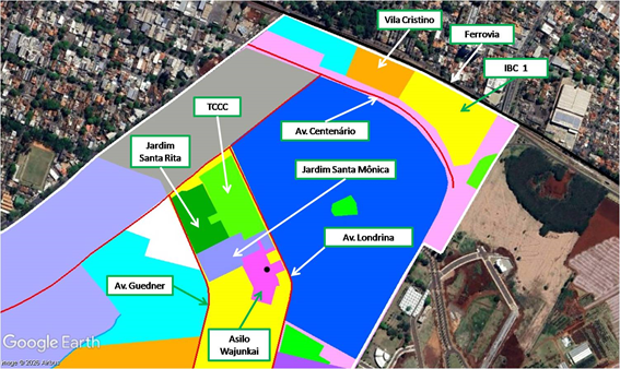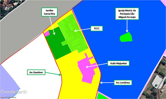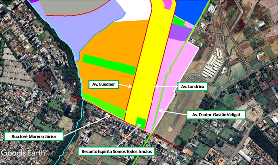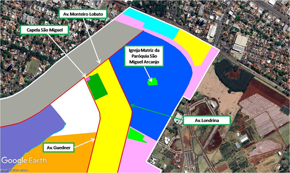 Os pontos vermelhos mostram a localização dos edifícios construídos na Zona Fiscal 8, principalmente a partir do início da década de 2000, ao longo das avenidas Guedner (em verde claro), Londrina (em amarelo), Doutor Gastão Vidigal (em verde escuro), Monteiro Lobato (em azul claro); e Travessa Liberdade (em preto).