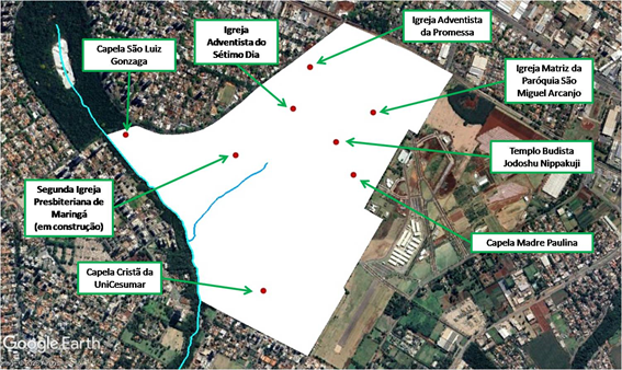 Localização dos templos religiosos atualmente existentes na Zona Fiscal 8, catalogados pelo autor.