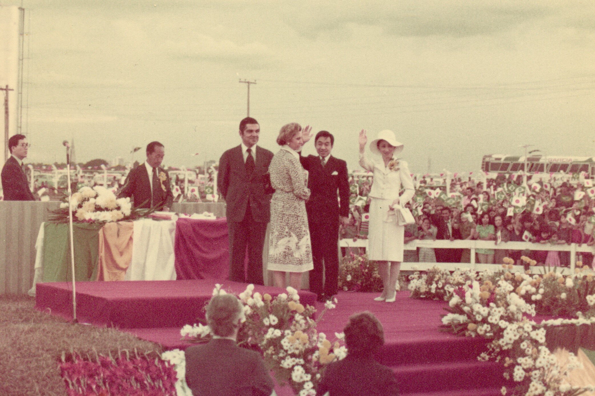 Os então príncipes herdeiros do Japão, Michiko e Akihito, ao lado do governador do Paraná, Jayme Canet Jr., e sua esposa, em solenidade de lançamento da pedra fundamental da futura sede da Acema.