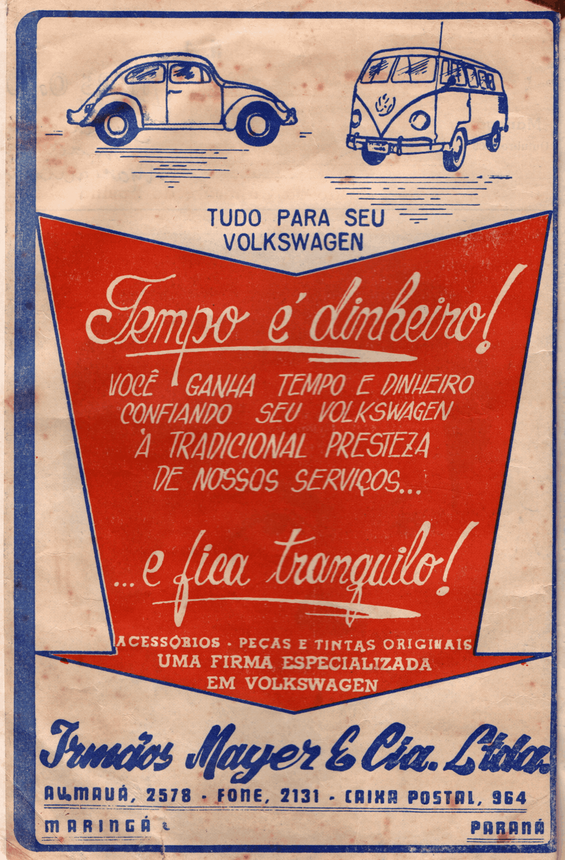 Ofertando peças, tintas e acessórios, além de serviço especializado, a divulgação arremata: “Tempo é dinheiro. Você ganha tempo e dinheiro confiando seu Volkswagem à tradicional presteza de nossos serviços... e fica tranquilo”.