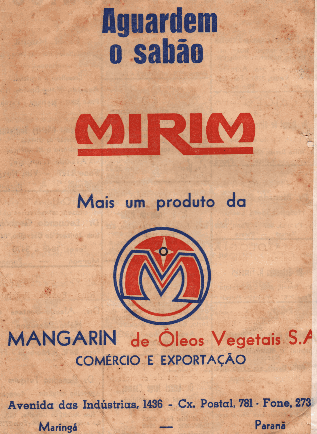 Produzido pela Mangarin de Óleos Vegetais S.A., o sabão Mirim estava prestes a ser lançado no final da década de 1960, conforme anúncio veiculado na contracapa da revista Difusão Cultural, publicada em outubro de 1969.