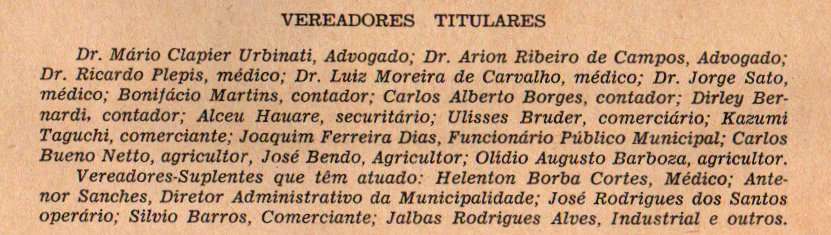 O anuário ainda ressalta a atuação da Câmara Municipal, atribuindo aos vereadores participação no desenvolvimento das ações administrativas. Ao final, apresenta a composição do Legislativo à época, com nomes de vereadores titulares e suplentes, bem como integrantes da mesa diretora.